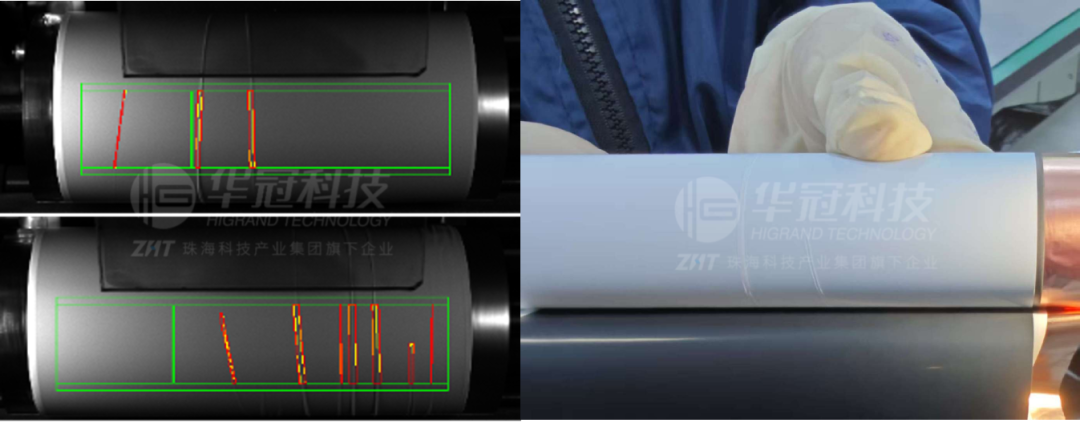 华冠科技在客户现场拆解检测出的打皱电芯实物(右)